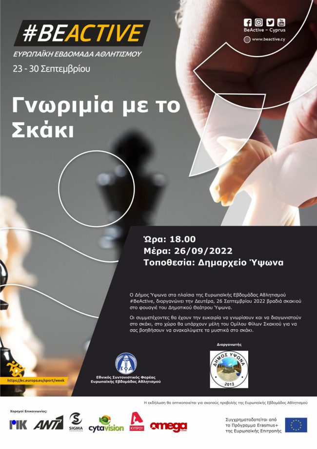 Ο Δήμος Ύψωνα στα πλαίσια της Ευρωπαϊκής Εβδομάδας Αθλητισμού #BeActive, διοργανώνει την Δευτέρα, 26 Σεπτεμβρίου 2022 βραδιά σκακιού στο φουαγιέ του Δημοτικού Θεάτρου Ύψωνα. Οι συμμετέχοντες θα έχουν την ευκαιρία…