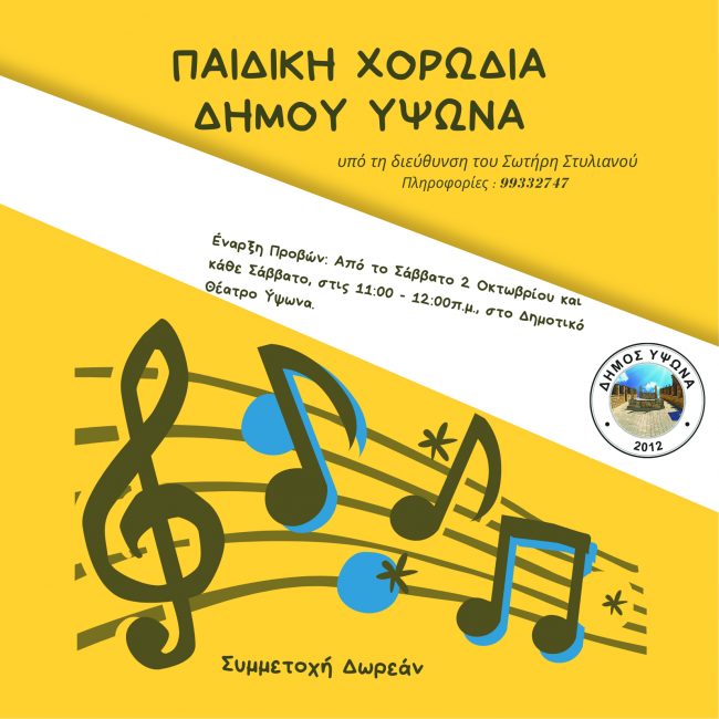 Ο Δήμος Ύψωνα ανακοινώνει την δημιουργία Παιδικής Χορωδίας Δήμου Ύψωνα για παιδιά 6-17 χρονών, και καλεί όλους τους γονείς των παιδιών που επιθυμούν να ενταχθούν στην παιδική χορωδία να δηλώσουν…
