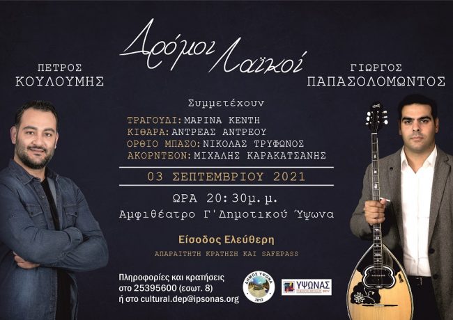 Ο Δήμος Ύψωνα και το Δημοτικό Συμβούλιο Νεολαίας Δήμου Ύψωνα σας προσκαλούν στην συναυλία “Δρόμοι Λαϊκοί” με τον Πέτρο Κουλουμή και τον Γιώργο Παπασολομώντος. Ο Πέτρος Κουλουμής συναντά το δεξιοτέχνη…