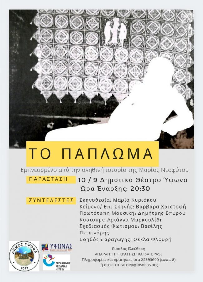 ΤΙ: Το Πάπλωμα είναι ένας πρωτότυπος θεατρικός μονόλογος της Βαρβάρας Χριστοφή σε σκηνοθεσία Μαρίας Κυριάκου, εμπνευσμένος από την αληθινή ιστορία της Μαρίας Νεοφύτου από την Ανώγυρα, που διαδραματίστηκε στο νησί μας έναν…