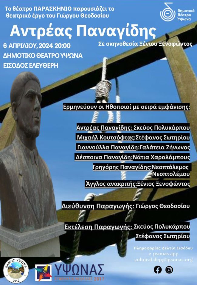 Η θεατρική ομάδα “Το Παρασκήνιο” παρουσιάζει το θεατρικό έργο του Γιώργου Θεοδοσίου «ΑΝΔΡΕΑΣ ΠΑΝΑΓΙΔΗΣ». Σάββατο 06/04/2024 Δημοτικό Θέατρο Ύψωνα 20:00 ΕΙΣΟΔΟΣ ΕΛΕΥΘΕΡΗ (Μπορείτε να κρατήσετε την θέση σας μέσα απο…