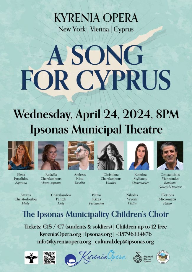 A Song for Cyprus Join us on Wednesday, April 24, 2024, 8pm, at Ipsonas Municipal Theatre for a tribute to the resplendent island of Cyprus—a land of beauty, hope, and…