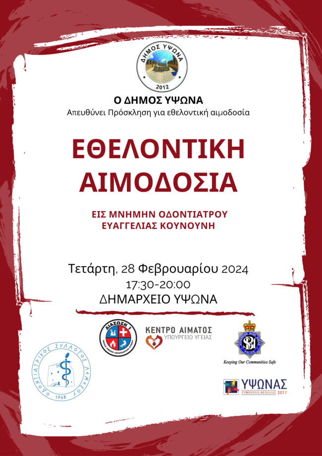 Ο Δήμος Ύψωνα με την υποστήριξη του Κέντρου Αίματος του Υπουργείου Υγείας διοργανώνει εθελοντική αιμοδοσία την Τετάρτη, 28 Φεβρουαρίου 2024 στο Δημαρχείο Ύψωνα από τις 17:30 μέχρι τις 20:00. Η…
