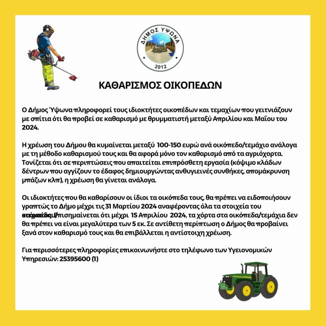 Ο Δήμος Ύψωνα πληροφορεί τους ιδιοκτήτες οικοπέδων και τεμαχίων που γειτνιάζουν με σπίτια ότι θα προβεί σε καθαρισμό με θρυμματιστή μεταξύ Απριλίου και Μαΐου του 2024. Η χρέωση του Δήμου…