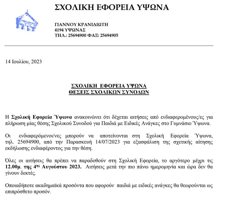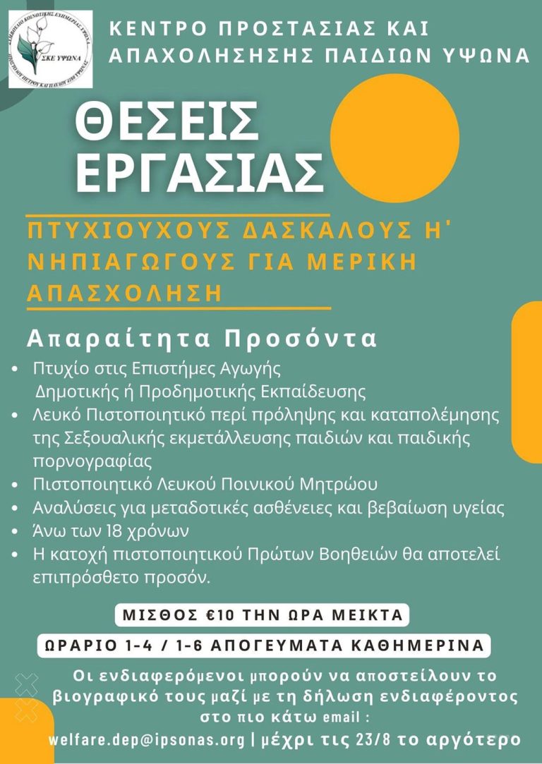 Το Σ.Κ.Ε. Ύψωνα ανακοινώνει νέες θέσεις εργασίας για το Κέντρο Προστασίας και Απασχόλησης Παιδιών Ύψωνα.