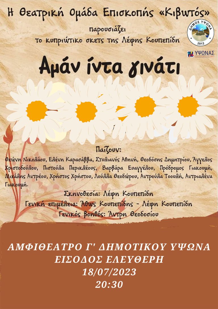 Τετάρτη 02/08/2023 Αμφιθέατρο Γ΄ Δημοτικού Ύψωνα 20:30 ΕΙΣΟΔΟΣ ΕΛΕΥΘΕΡΗ Πληροφορίες στο 25395600 (εσωτ. 8 ) ή μέσω email: cultural.dep@ipsonas.org «Συμπέθεροι…