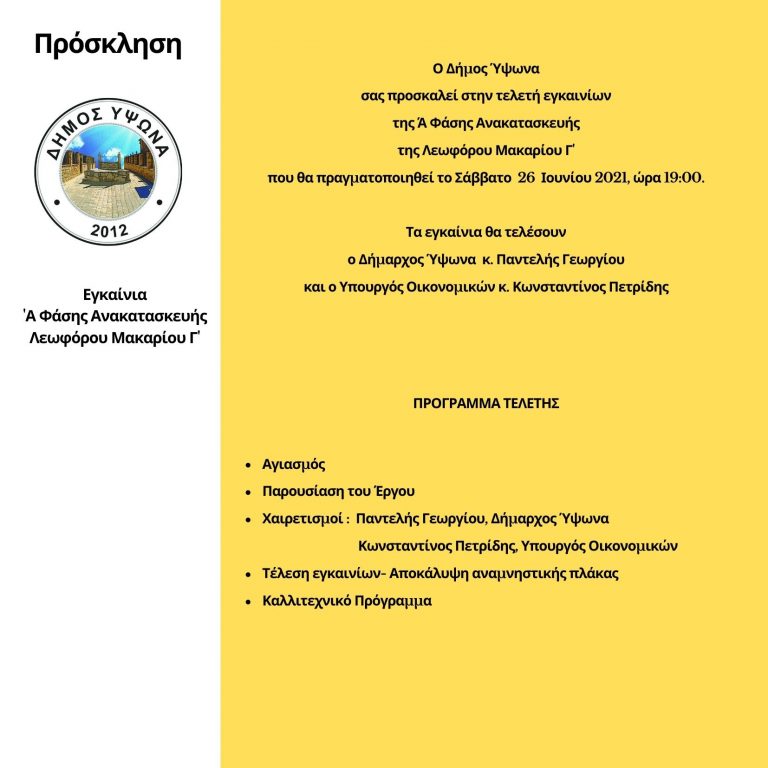 Ο Δήμος Ύψωνα σας προσκαλεί στα επίσημα εγκαίνια της ‘Α Φάσης Ανακατασκευής της Λεωφόρου Μακαρίου Γ’, που θα πραγματοποιηθούν το…