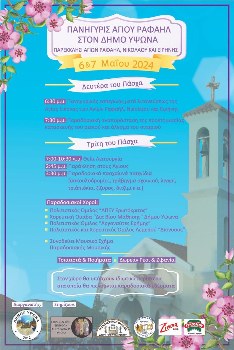 Την Τρίτη του Πάσχα, 7 Μαΐου 2024, ο Ύψωνας γιορτάζει την εορτή των Αγίων Ραφαήλ, Ειρήνης και Νικολάου στο ομώνυμο…
