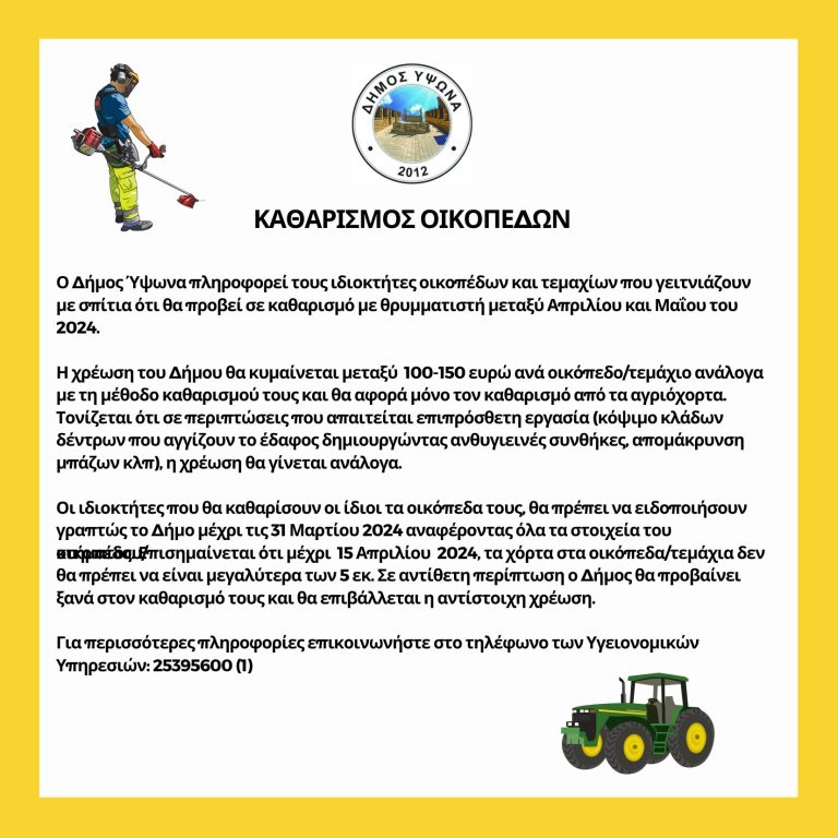 Ο Δήμος Ύψωνα πληροφορεί τους ιδιοκτήτες οικοπέδων και τεμαχίων που γειτνιάζουν με σπίτια ότι θα προβεί σε καθαρισμό με θρυμματιστή…